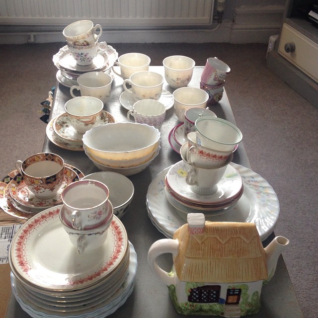 My lovely mum and chum were just as helpful, finding things that I’d missed, either because something else had caught my attention (most notably, a fridge-shaped teapot), or because they were too high for me to have noticed. After a couple of hours, we’d rehomed 6 teapots, 28 tea cups, 44 saucers, 37 plates, 3 milk jugs, 8 sugar bowls and 7 cake plates, and were feeling very pleased with ourselves.